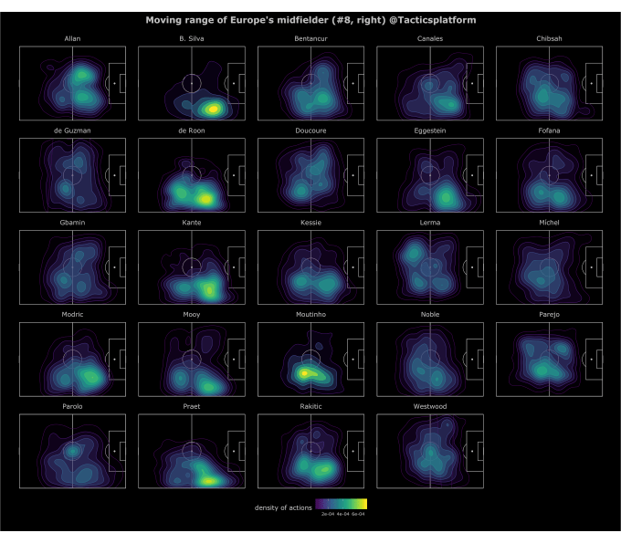 The greener the color, the more concentrated the touches are. The larger the area, the more ground as player covers.